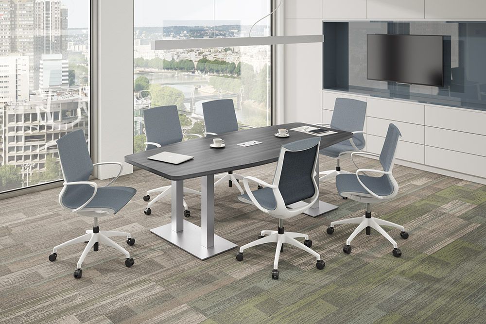 These laminate conference table with the Palmer House Base is attractive and durable making this table perfect for any application. The Palmer House base is an attractive design available in brushed steel or painted black.
